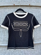 Every cowgirl has an eye for the ever popular bootstitch pattern on their favorite boots and it sure does come to life beautifully scaled-up and created in studding and rhinestones! The juxtaposition of hardware and sparkle against a classic cotton tee make it a memorable piece you can dress up or down! Don’t miss out on this beauty!